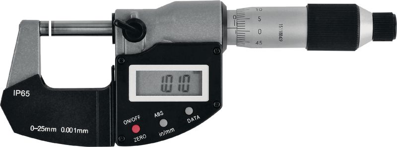 Skalentrommel und Skalenhülse mattverchromt. Messflächen mit Hartmetall bestückt, geschliffen und feinstgeläppt.