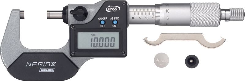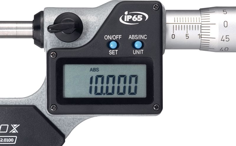Bügelmessschraube mit Ratsche, Skalentrommel und Skalenhülse mattverchromt. Messflächen mit Hartmetall bestückt, geschliffen und feinstgeläppt.