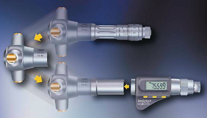 Selbstzentrierende und selbstausrichtende Innenmessschraube mit einer 3-Linien-Berührung am Prüfgegenstand. Einsetzbar für Durchgangsbohrungen.
