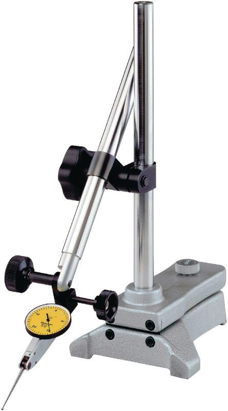 Gusssockel geschliffen, frontale Anschlagfläche, Säule und Arm aus gehärtetem Stahl, Aufnahme für Schwalbenschwanz, Rundspannung oder Öse. Spielfreie Feineinstellung über Blattfeder.