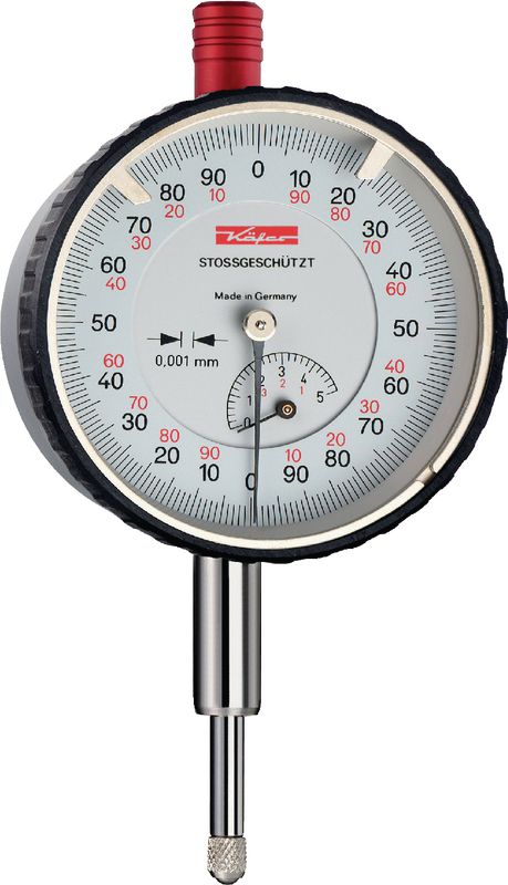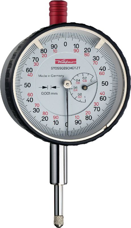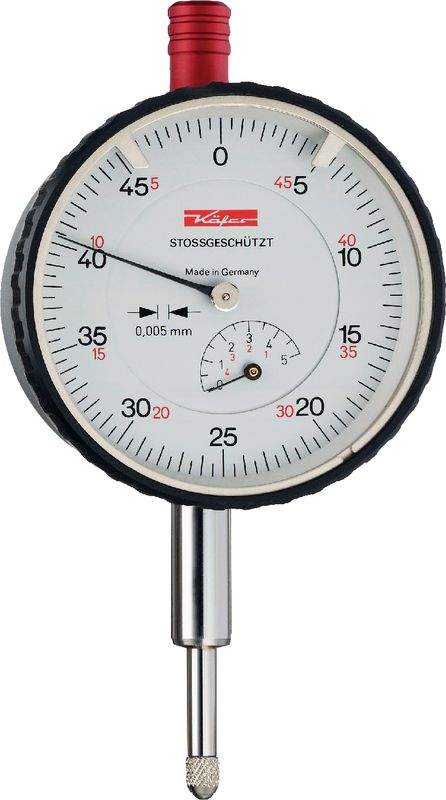 Mit Stossschutz. Drehbares Zifferblatt mit Toleranzmarken. Messbolzen und Einspannschaft aus nichtrostendem Stahl.