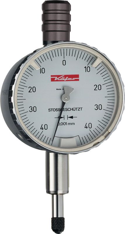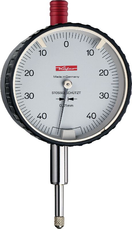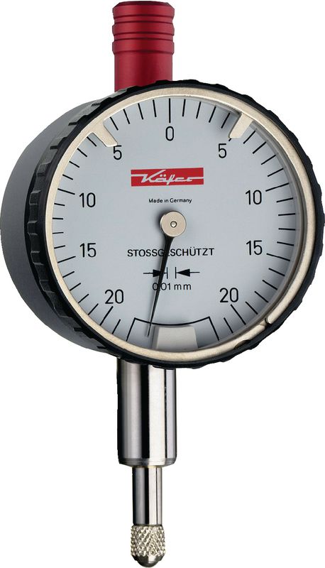 Sicherheitsmessuhr mit Freihub und Stossschutz. Die Messung erfolgt innerhalb einer einzigen Ziffernblatt-Umdrehung. Drehbares Zifferblatt mit Toleranzmarken. Messbolzen und Einspannschaft aus nichtrostendem Stahl.