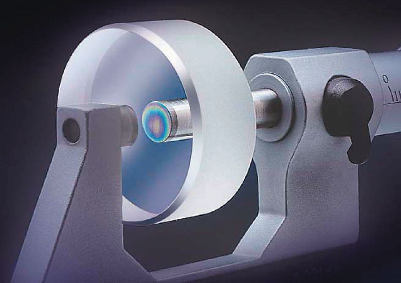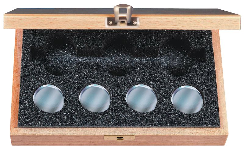 Zur Prüfung der Ebenheit und Parallelität der Messflächen von Bügelmessschrauben. Lieferung in Sätzen zu 4 bzw. 3 Prüfgläsern. Die Längenstufung entspricht jeweils einem Viertel bzw. einem Drittel der Messspindelsteigung von 0.5 mm.