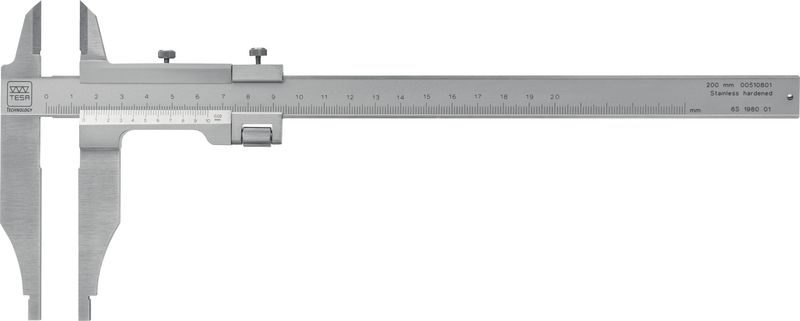 Ausführung mit Feinverstellung Mit gerundeten Messflächen für Innenmessungen und schneidenförmigen Messflächen für Aussenmessungen. Rostfrei, mit Feststellschraube, Nonius und Skala mattverchromt.